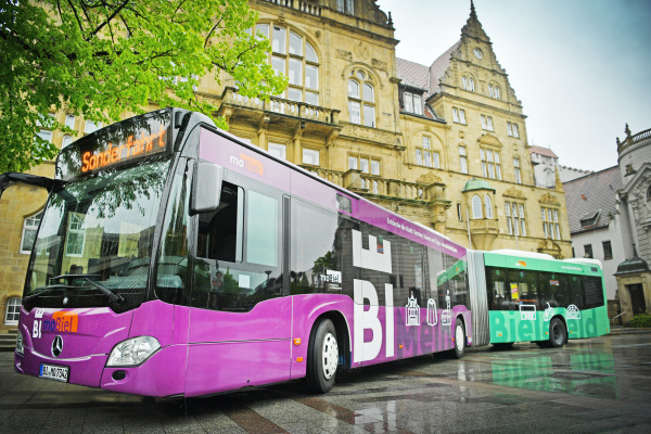 Innerhalb der Stadt und aus dem Umland sorgt das Verkehrsunternehmen moBiel mit Stadtbahnen und Bussen für eine dichte Taktung und gute Erreichbarkeit. Besucher:innen können so unkompliziert vom Bahnhof, von Hotels oder von Parkplätzen am Stadtrand in die Innenstadt gelangen. Die Zugänge zu den zentralen Haltestellen Jahnplatz, Rathaus und Hauptbahnhof sind barrierefrei.