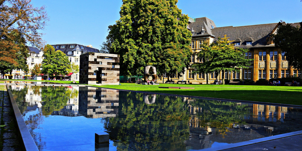Der Skulpturenpark der Kunsthalle Bielefeld verbindet Naturerlebnis mit Kunstgenuss in der Bielefelder Altstadt. Werke von Olafur Eliasson, Sol LeWitt, Henry Moore und Thomas Schütte sind über schlaufenförmige Wege erreichbar. Zu den beliebten Fotomotiven gehören auf jeden Fall das elegante Wasserbecken und das "Final Wooden House" des japanischen Architekten Sou Fujimoto.