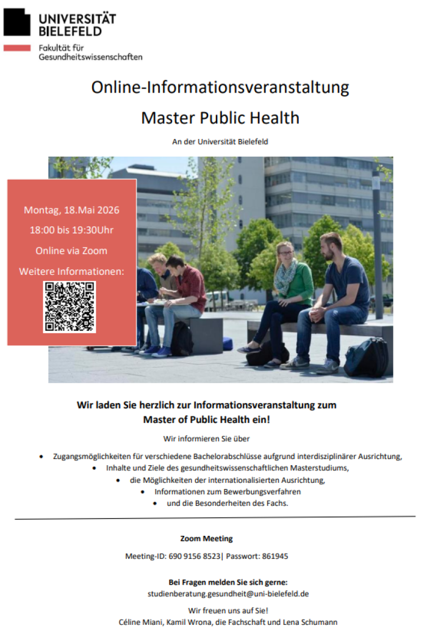 Sie überlegen was Sie nach Ihrem Bachelorstudium machen möchten? Dann möchten wir, die Fakultät für Gesundheitswissenschaften, Sie herzlich zu unserer Informationsveranstaltung zum Master of Science in Public Health am 18.05.2026 um 18Uhr via Zoom einladen!