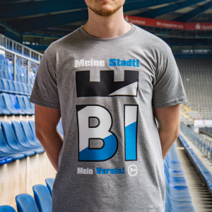 Eine besondere Heimatliebe trifft auf besonderen Fußballstolz: Bielefeld Marketing und Arminia Bielefeld bringen zum Erstliga-Aufstieg des Vereins das erste gemeinsame Bielefeld-Fan-T-Shirt heraus. Das Oberteil in Hellgrau wird geschmückt vom schwarz-weiß-blau gestreiften Stadtlogo, mit dem das Stadtmarketing dem Club zum Aufstieg gratuliert hatte.