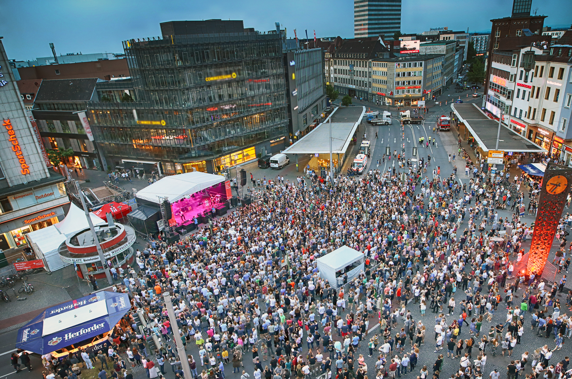 Bielefeld feiert vom 29. Mai bis 2. Juni 2019 fünf Tage Leineweber-Markt in die Innenstadt. Auf dem Programm stehen als Highlights wieder große Live-Konzerte mit bekannten Pop-Acts auf dem Jahnplatz. Bis zu 8.000 Menschen jubelten hier zuletzt Stars wie Wincent Weiss (2017) und Glasperlenspiel (2018) zu. In diesem Jahr hält Bielefeld Marketing, Veranstalter des Leineweber-Marktes, einen Platz als Vorband auf der Jahnplatz-Hauptbühne, präsentiert von der Sparkasse Bielefeld, frei – für spannende Künstler aus der Region. Die Entscheidung treffen die Fans des Leineweber-Marktes: Heute startet das Voting für „Wer rockt den Leineweber?“