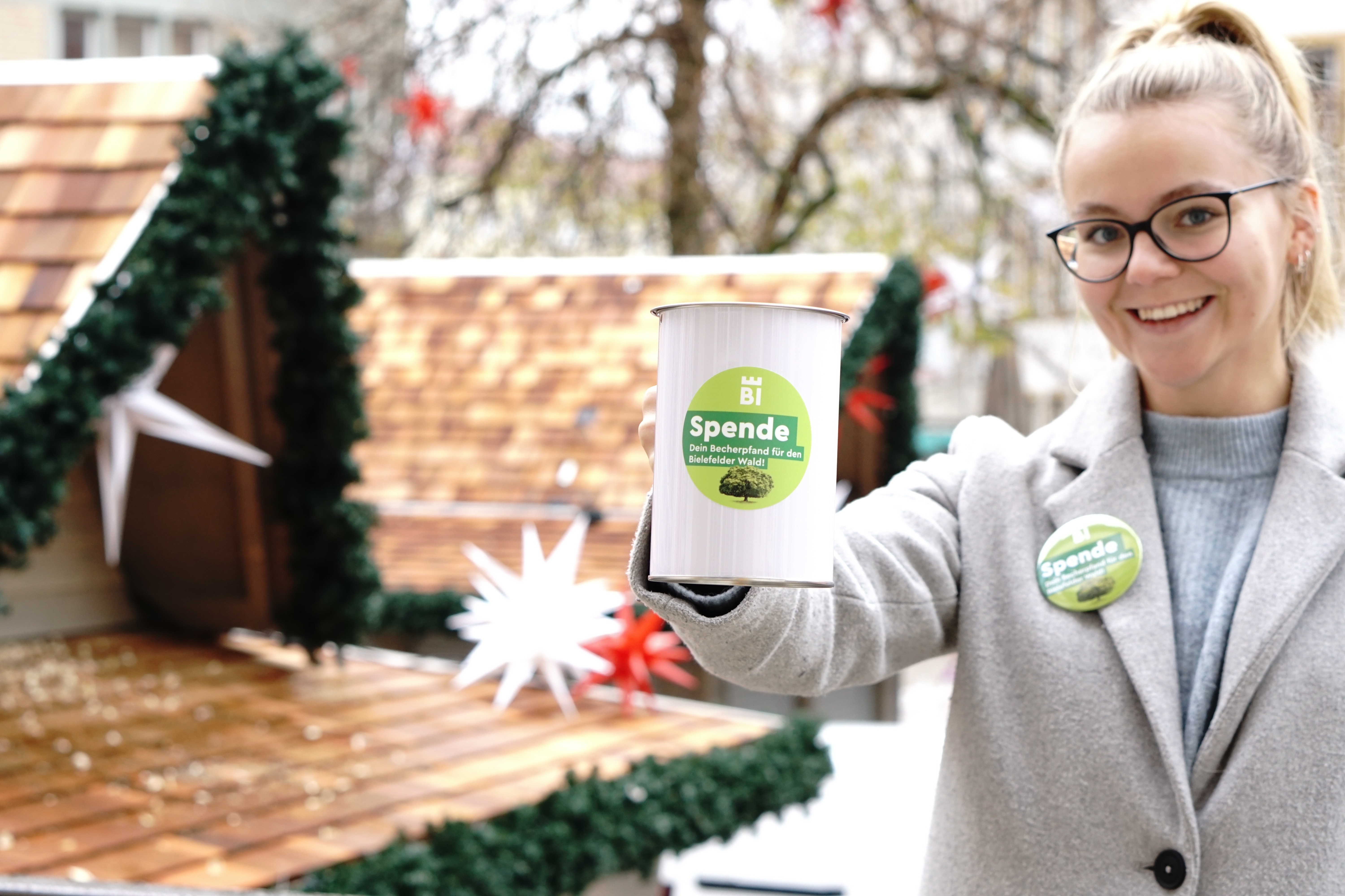 Bielefelder Weihnachtsmarkt-Besucher können ihren Becherpfand für den Bielefelder Stadtwald spenden. Die Sammeldosen stehen an den Pfandrückgabe-Stellen bereit.