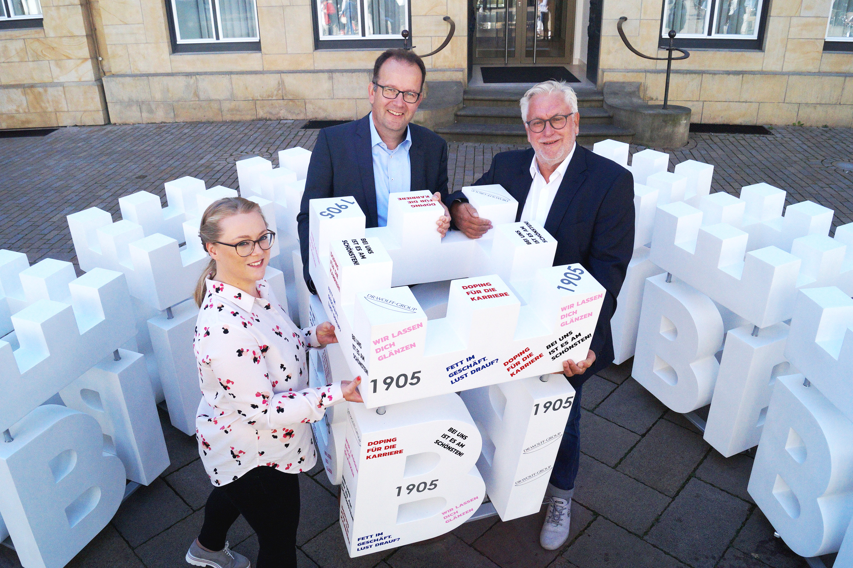 Als einer der ersten nahm die Dr. Wolff Group ein Logo in Empfang. Dort gestalten Auszubildende ein Unikat für das Unternehmen. „Wir bedanken uns beim Team von Bielefeld Marketing für die Skulptur und die Möglichkeit, diese durch unsere Auszubildenden individuell zu gestalten. Wir verstehen unser Engagement seit vielen Jahren als aktiv gelebte Partnerschaft mit Bielefeld Marketing. Für uns als Arbeitgeber ist Standortmarketing ein wichtiger Faktor im Employer Branding. Bielefeld ist nicht erst durch Arminias Aufstieg und kreative Kommunikationsideen auf der Landkarte. Eine starke Wirtschaft, die Bildungs- und Forschungseinrichtungen gepaart mit hoher Lebensqualität zeichnen Bielefeld aus. Es freut uns daher sehr, heute den Auftakt für die #BielefeldLiebe Skulpturen-Aktion zu machen und als Unternehmen ein Zeichen zu setzen“, sagt Marcel Klöpping, Pressesprecher der Dr. Wolff Gruppe.