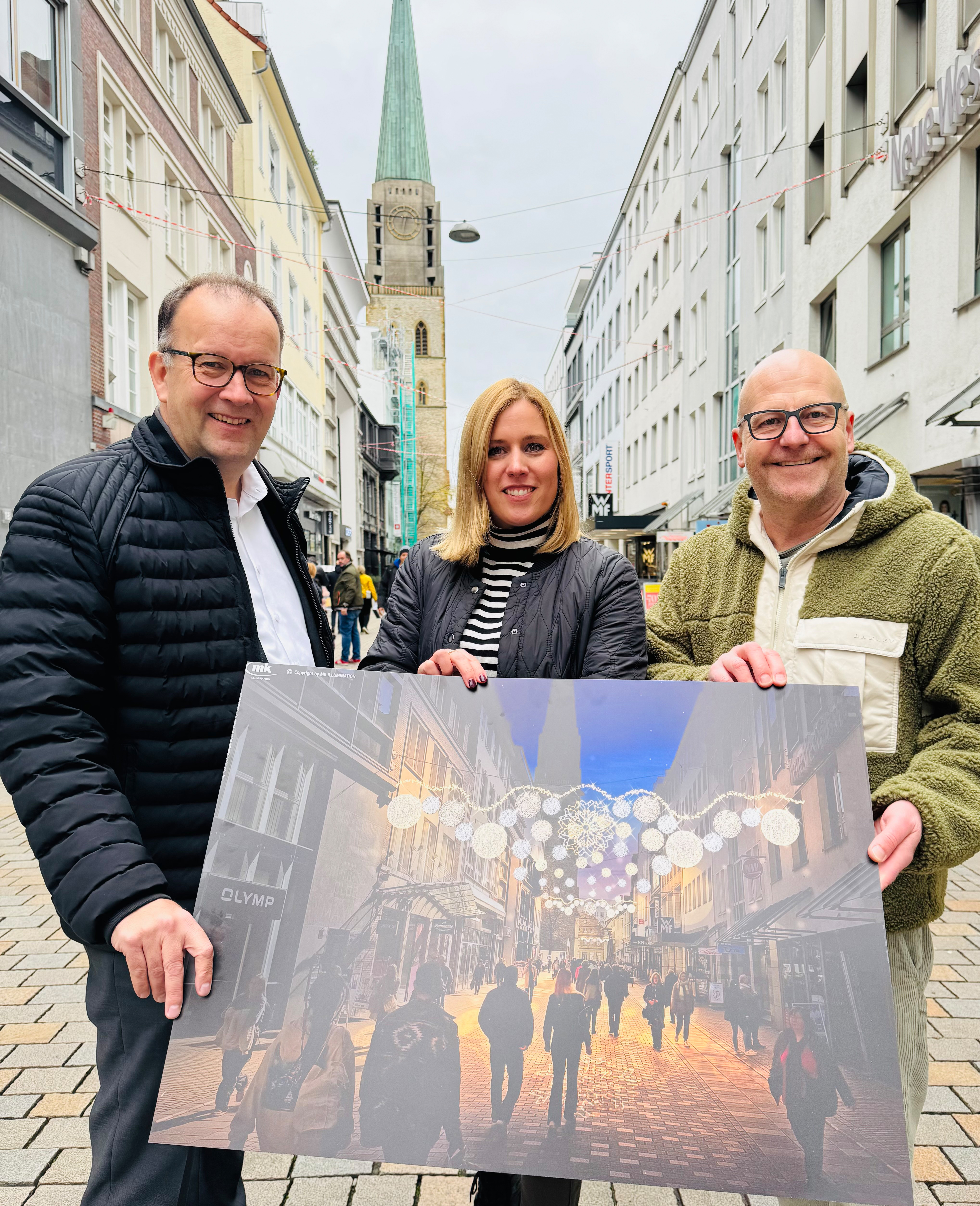Martin Knabenreich (l.) und Julia Lehmann von Bielefeld Marketing zeigen gemeinsam mit Henner Zimmat vom Altstadt Team eine Illustration, wie die Winterbeleuchtung in dem Teilstück an der Niedernstraße aussehen könnte.