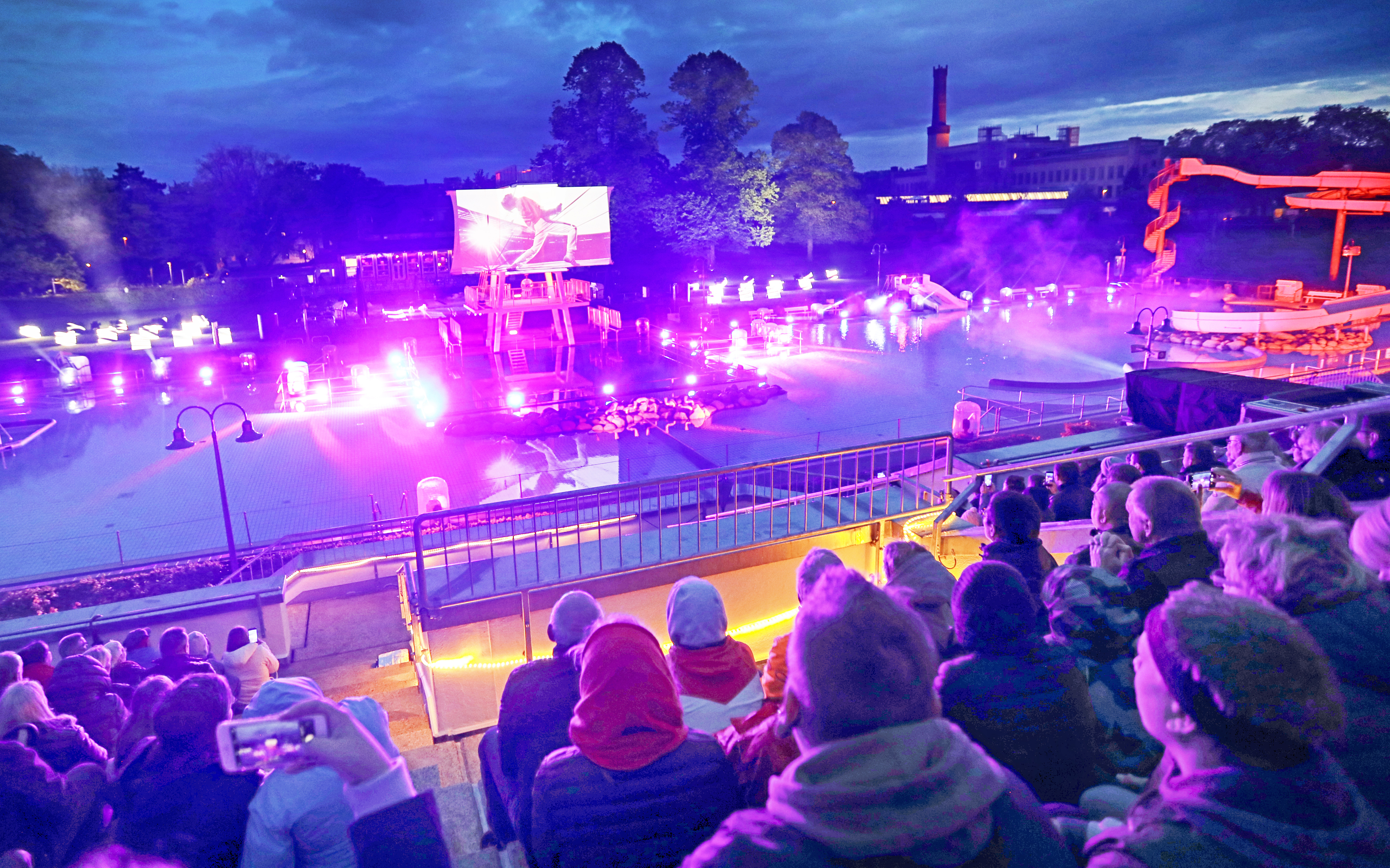 Im Wiesenbad laufen die Vorbereitungen auf Hochtouren: Hier findet am Samstagabend fünfmal eine große Licht- und Wasser-Show statt (21.00 Uhr, 21.45 Uhr, 22.30 Uhr, 23.15 Uhr, 0.00 Uhr). Wie bereits im Jahr 2019 wird das Schwimmbad stimmungsvoll illuminiert. Das multimediale Programm, das vom Bielefelder Unternehmen Provisuell realisiert wird, setzt mit atemberaubenden Effekten die Themen Wasser, Licht und Nachhaltigkeit in Szene. „Das Publikum erwarten meterhohe, präzise choreografierte Wasserfontänen und ein aufwändiges Licht-Spektakel“, kündigt Katharina Schilberg an, Leiterin der Veranstaltungs-Abteilung bei Bielefeld Marketing. Schilberg weiter: „Gleichzeitig läuft eine großflächige Video-Show, die das Programm komplett macht.“