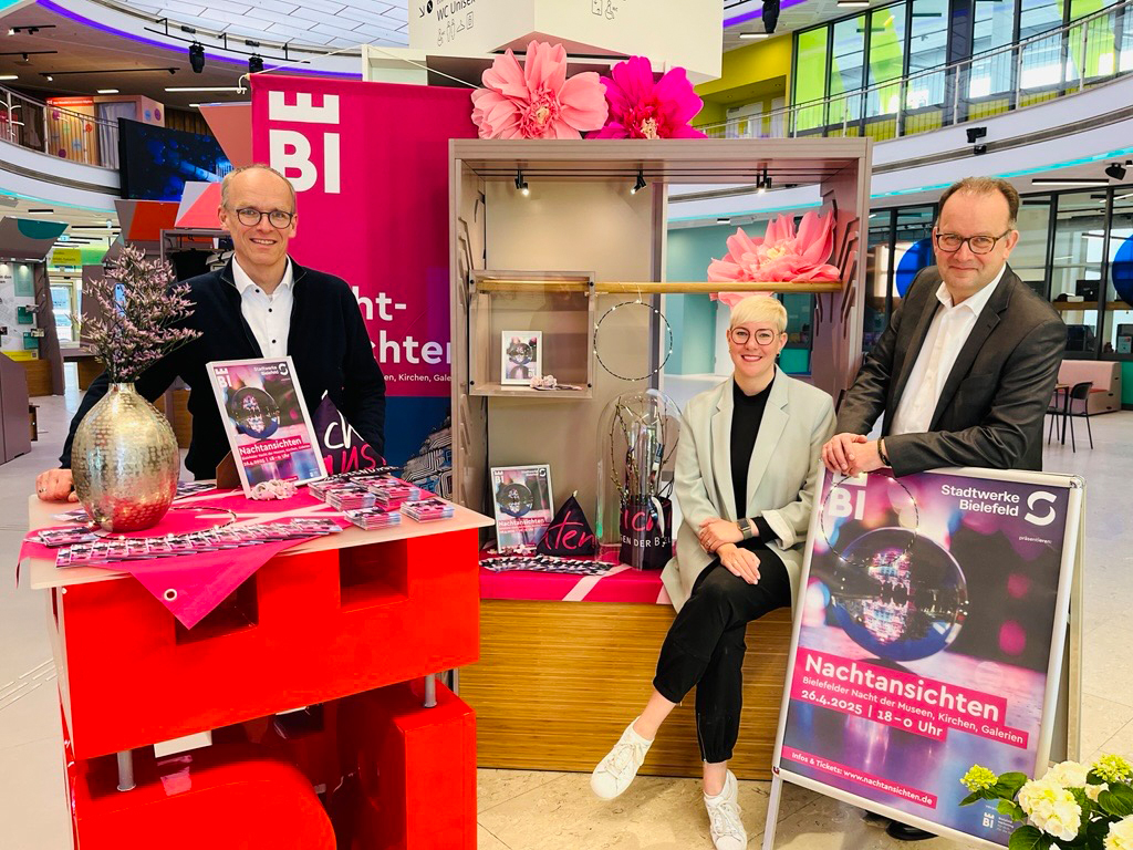 Martin Uekmann (v. l., Stadtwerke Bielefeld), Katharina Schilberg und Martin Knabenreich (beide Bielefeld Marketing) präsentieren in der Tourist-Information in der Wissenswerkstadt das volle Kultur-Programm der Nachtansichten 2025. Die Wissenswerkstadt ist erstmalig bei den Nachtansichten dabei und beherbergt gleichzeitig die Tourist-Information als erste Adresse für die ganze Nacht.