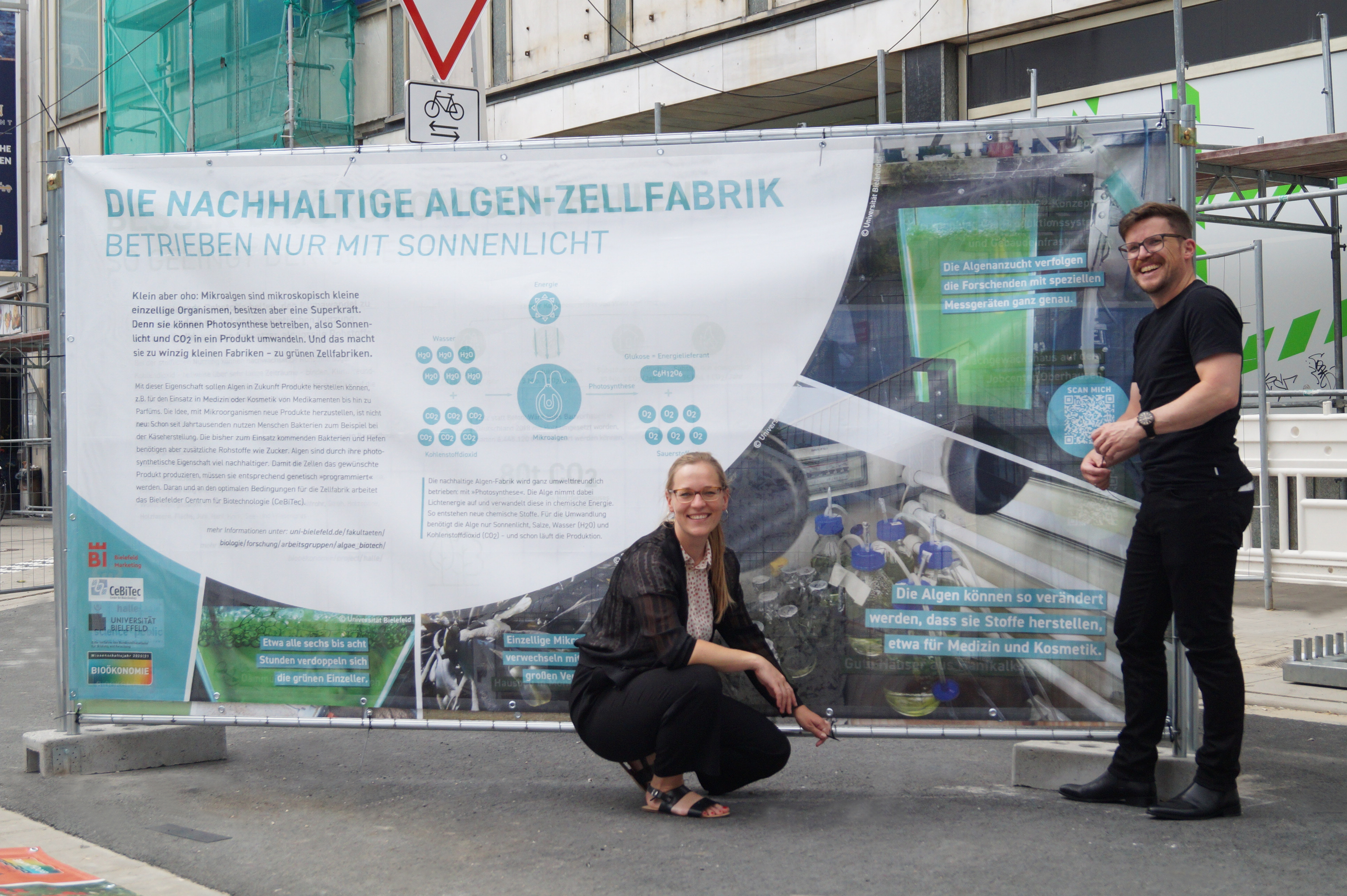 „Hier kann man sich im Vorbeischlendern über aktuelle Projekte informieren und einen Überblick über die Antworten der Wissenschaft zu drängenden Problemen unserer Zeit erhalten“, sagt Gesa Fischer vom Wissenschaftsbüro der Bielefeld Marketing und betont: „Die Bauzaunbanner bestehen zu hundert Prozent aus recycelten PET-Flaschen und werden nach Ende der Ausstellung für Kunstprojekte wiederverwertet.“