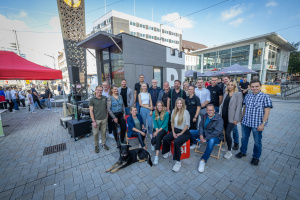 Bielefeld ist kreativ und ständig in Bewegung. Während der tu:bie-Enthüllung und anschließenden Eröffnungsveranstaltung konnten geladene Gäste und zufällig Vorbeikommende auf dem Jahnplatz es selbst erleben. Am späten Nachmittag entfernte Bielefeld Marketing in Anwesenheit von Vertreterinnen und Vertretern Bielefelder Unternehmen den Sichtschutz, der den mobilen, rund fünfeinhalb Meter langen und knapp zweieinhalb Meter breiten Event- und Erlebnisraum bis dahin verhüllt hatte. Ans Tageslicht kam ein modernes, hölzernes Miniaturhaus auf Rädern mit überdimensionalem, vier Meter hohem Bielefeld-Logo an drei Seiten. Die verglaste Front schmückt eine ausklappbare Terrasse, über die viel Licht in den Innenraum fällt. Eine Küchenzeile sowie ein kleines Badezimmer mit Toilette bieten alles, was man für eine Übernachtung braucht. Dabei funktioniert tu:bie weitgehend autark, energiesparend und smart, sodass der Einsatz ohne aufwendige Vorbereitung und Infrastruktur an unzähligen Orten möglich ist.