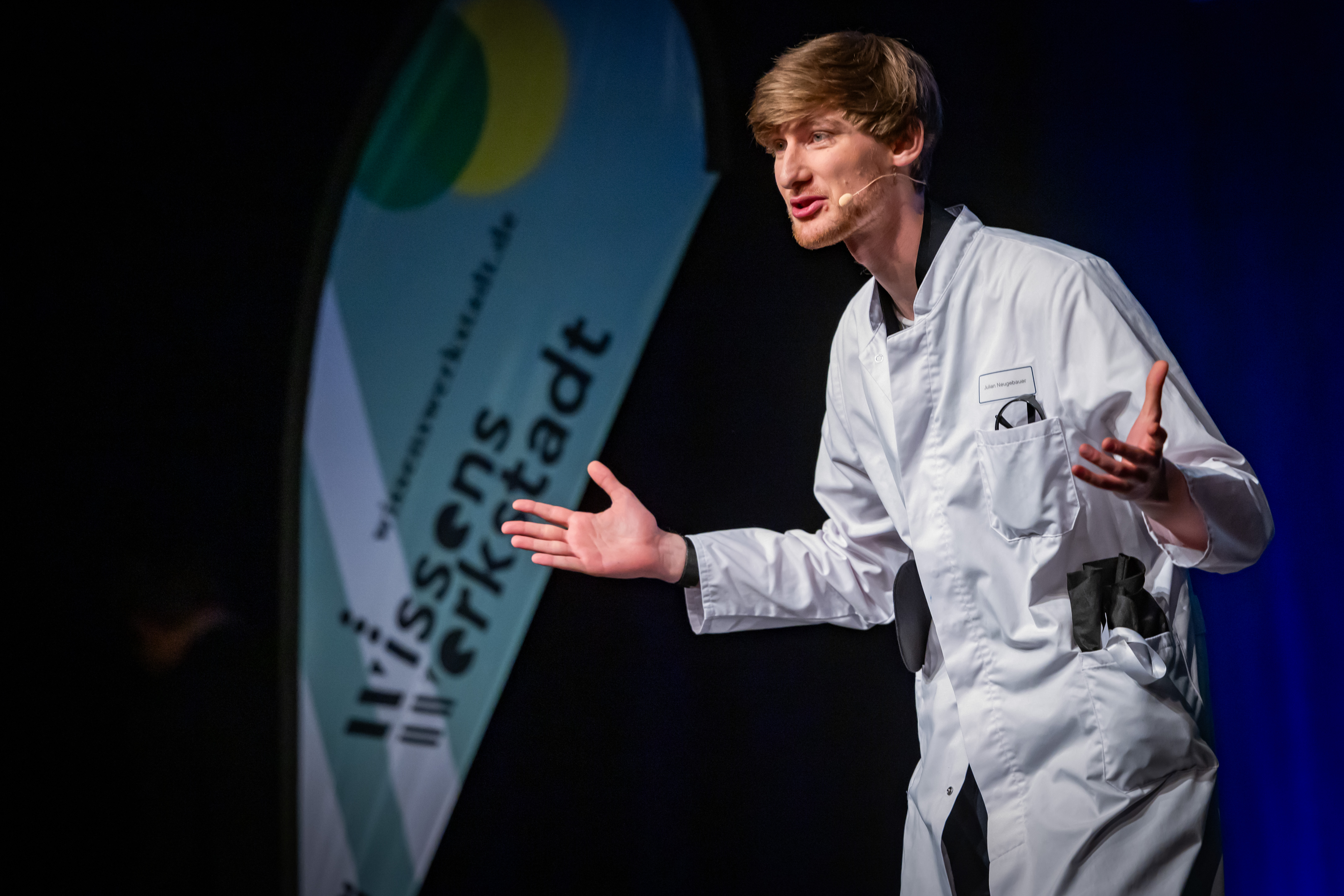 Der Informatikstudent Jonas Vaquet von der Universität Bielefeld gewann den regionalen Vorentscheid in Bielefeld. Bei seinem Vortrag „ChatGPT - Wie funktioniert das eigentlich?“ spannte er auf witzige Weise die 330 Zuschauenden im TOR6 Theaterhaus mit ein, die Funktionsweise – und die Schwächen – der sogenannten künstlichen Intelligenz zu demonstrieren.