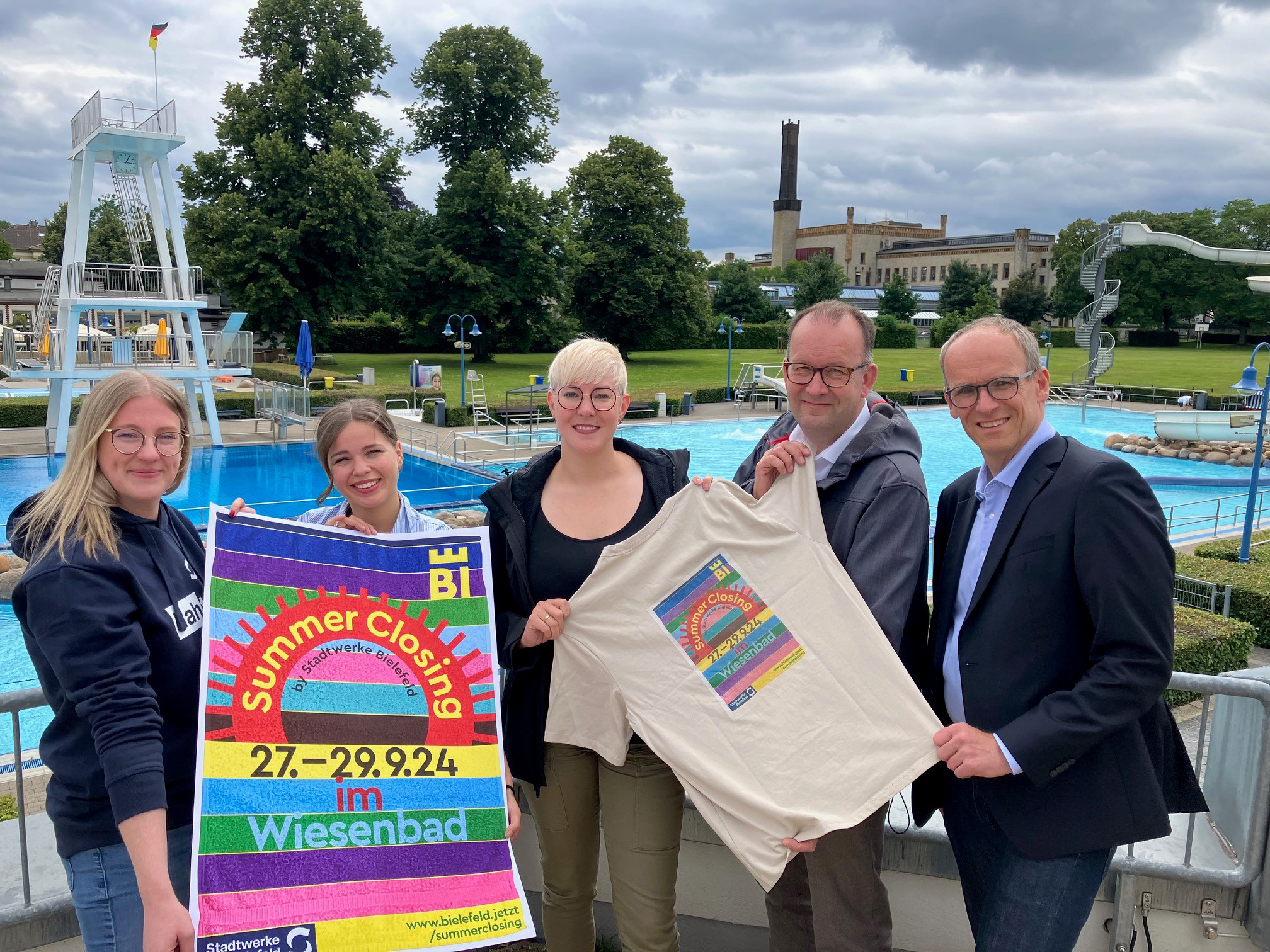 (v.l.): Eike Leoni Garnschröder, Projektleiterin Stadtwerke Bielefeld, Karoline Jockheck, Katharina Schilberg (Projektleiterinnen Bielefeld Marketing) und Bielefeld Marketing-Geschäftsführer Martin Knabenreich sowie Martin Uekmann, Geschäftsführer Stadtwerke Bielefeld, freuen sich auf die Konzertreihe im Wiesenbad.