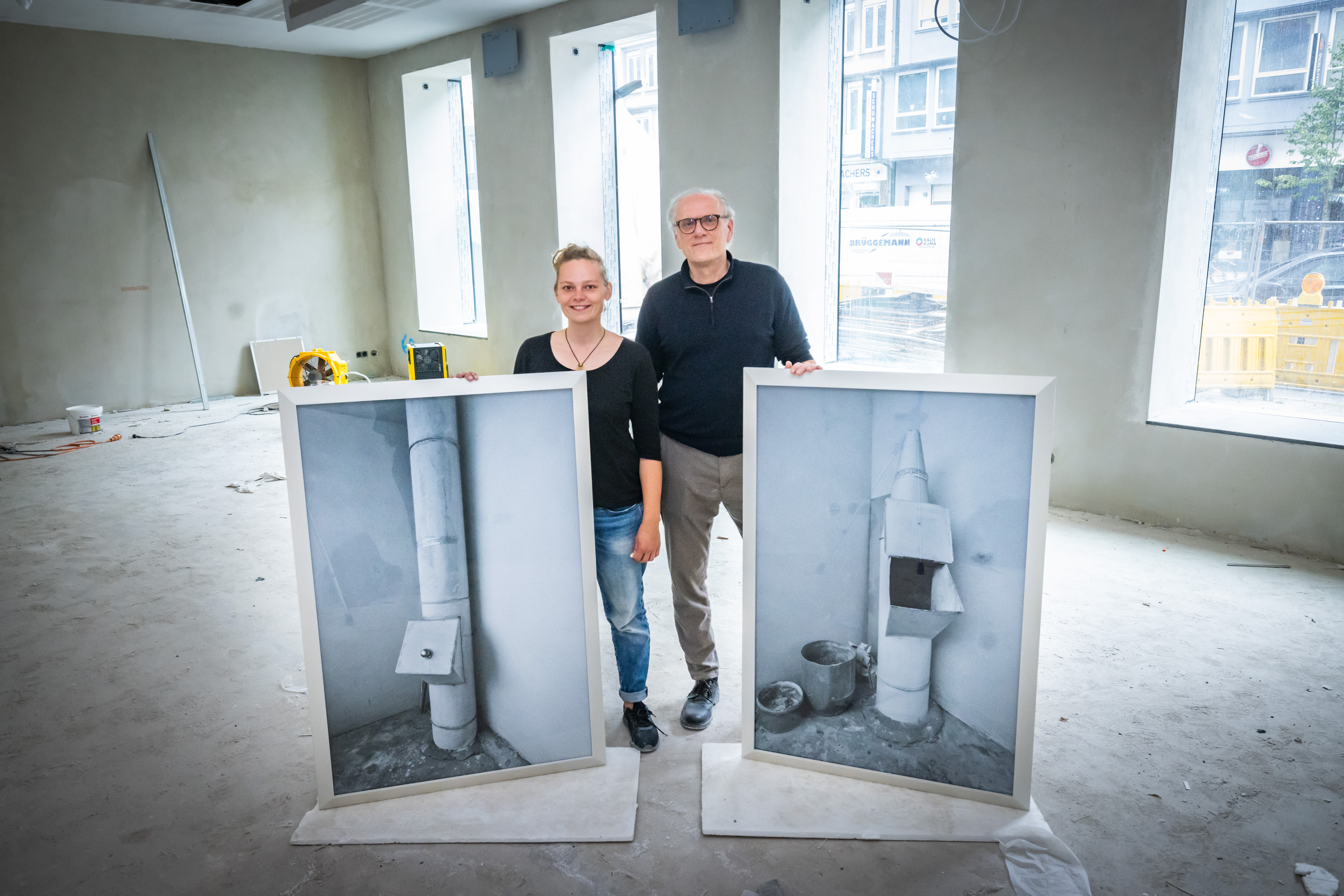 Direkt im Erdgeschoss findet sich bald die erste Ausstellung – zur Rückseite des Gebäudes hin gelegen in einem offenen hellen Raum mit großen Glasfenstern zur Verkehrsachse Herforder Straße. Hier entsteht auf 75 Quadratmetern ein Galerie-Raum für Studierende des Fachbereichs Gestaltung der Hochschule Bielefeld: der „HSBI-Satellit“.