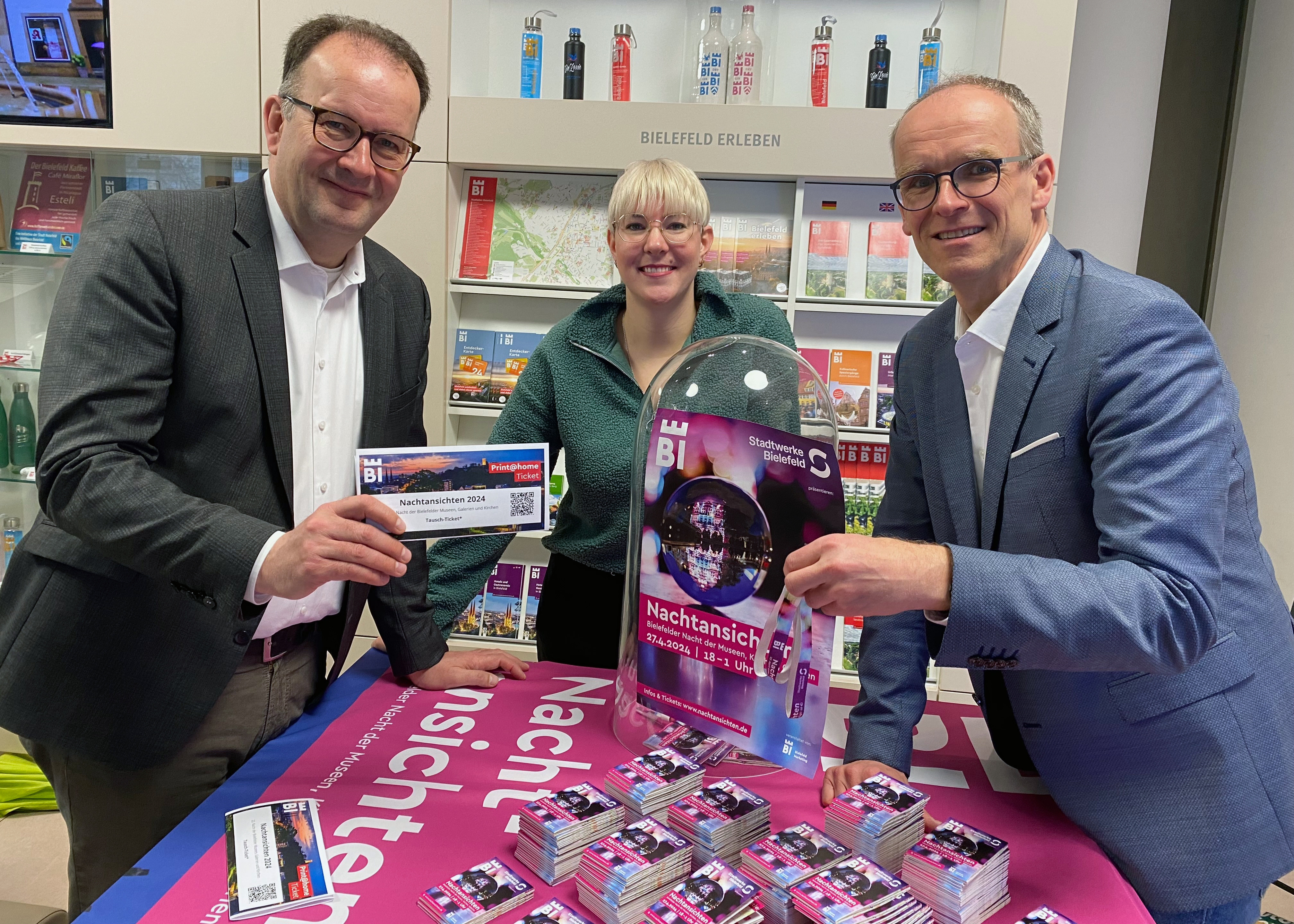 Martin Knabenreich und Katharina Schilberg (v. l., Bielefeld Marketing) stellen gemeinsam mit Martin Uekmann (Stadtwerke Bielefeld) das Programm für die Nachtansichten 2024 in der Tourist-Information vor. Wer ein print@home-Ticket online im Vorverkauf nimmt, spart Versandkosten, muss aber das Ticket in der Tourist-Information gegen ein Eintrittsbändchen fürs Handgelenk tauschen.