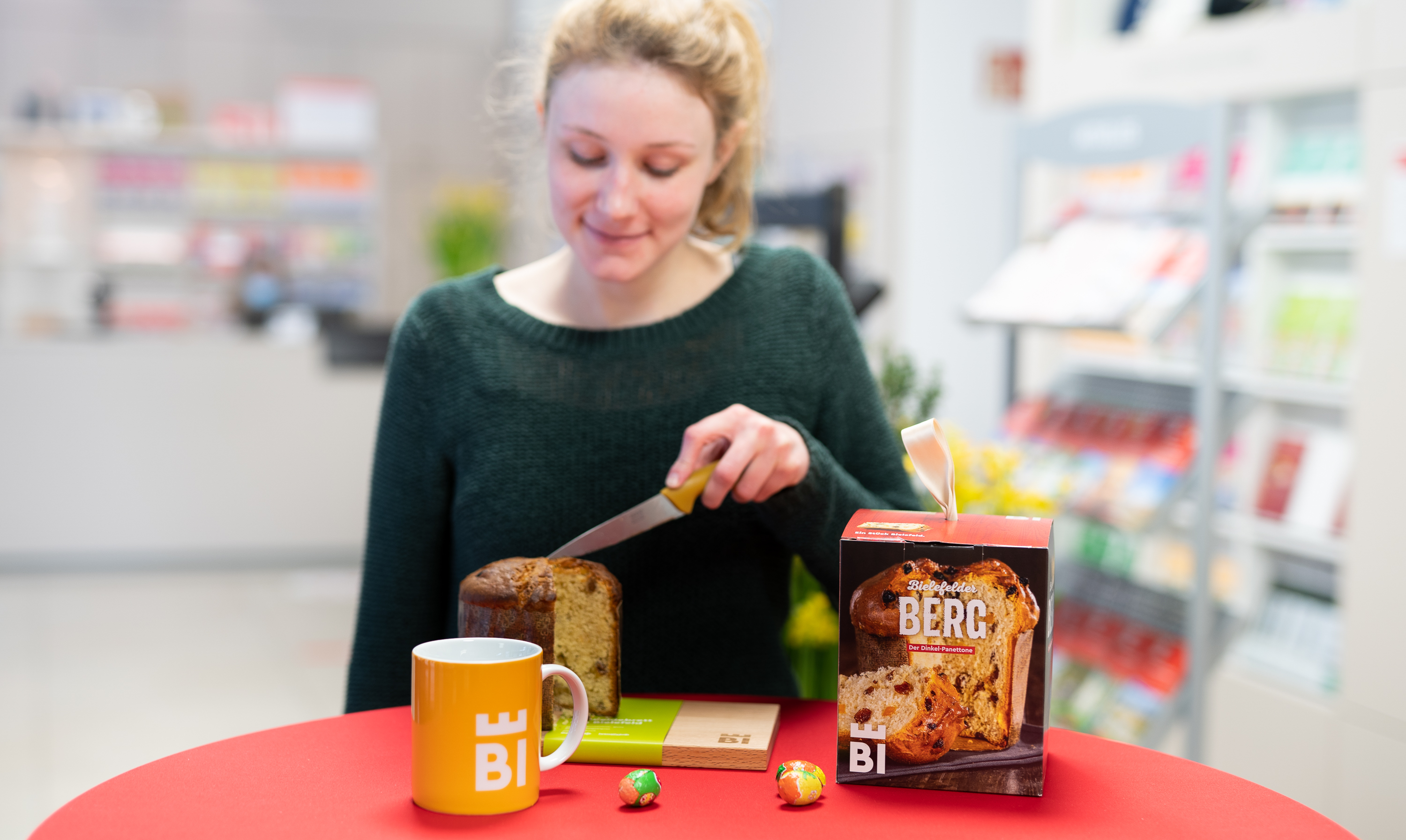 Der „Bielefelder Berg“ ist ein Dinkel-Panettone der Bäckerei Lechtermann-Pollmeier. Der Sauerteig wird mit heimischem Dinkelmehl, Butter, Salz und Wasser in mehreren Stufen angesetzt und entwickelt so in mehr als 20 Stunden Reifezeit sein Aroma. Optimal schneiden lässt sich das Ostergebäck auf dem Heimat-Frühstücksbrettchen aus geöltem Buchenholz aus der Region, das mit dem BIE-Logo als Lasergravur verziert ist. Hergestellt wird das Holzbrett in den proWerk-Werkstätten der v. Bodelschwinghschen Stiftungen Bethel. Zu einem Osterfrühstück darf der Pott Kaffee nicht fehlen, deshalb ist eine Tasse im Bielefeld-Design auch dabei – wählbar in rot, blau, grün, orange oder pink.