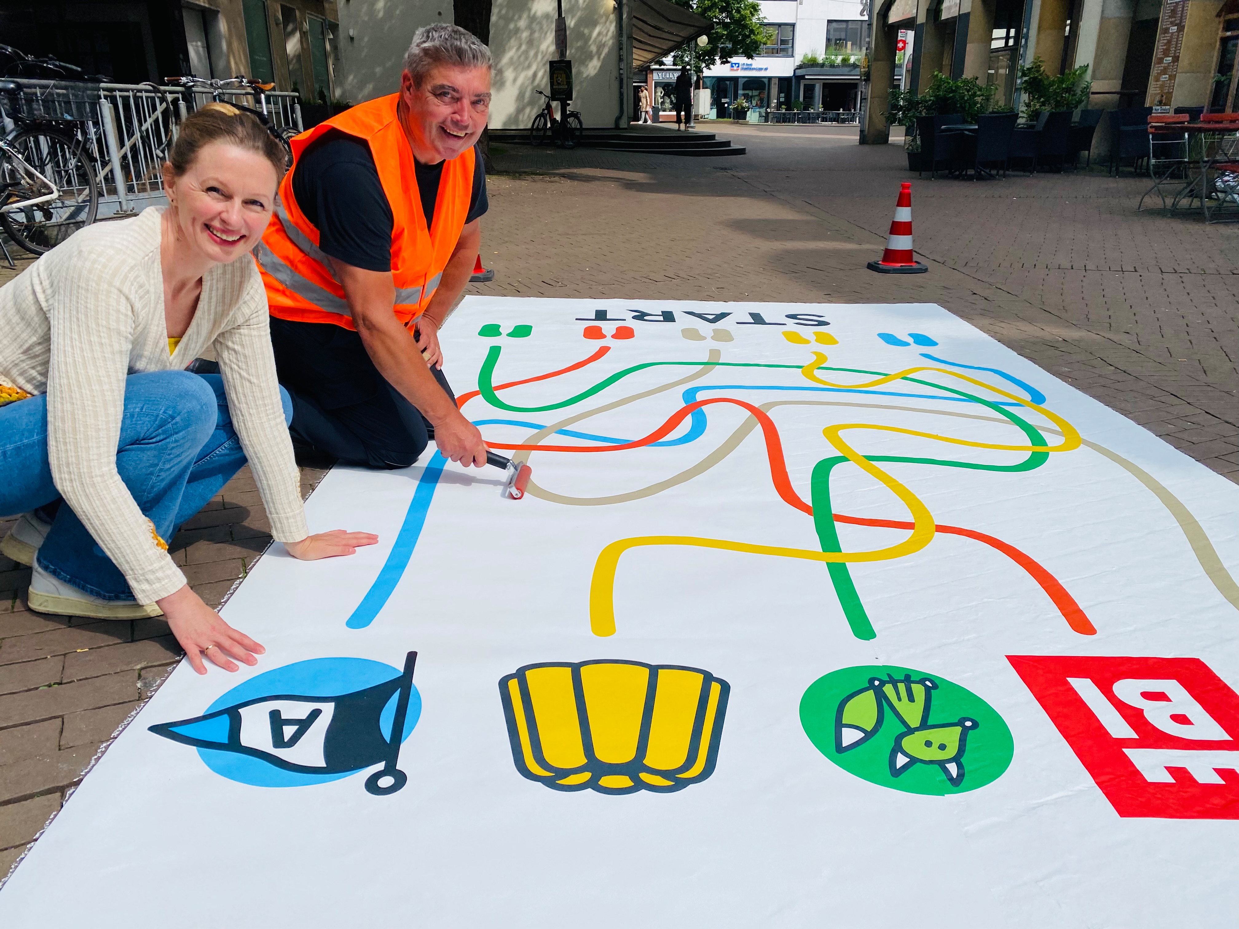 Birgit Schroers vom City-Management der Bielefeld Marketing GmbH hilft Axel Kramer von Trade in time UG aus Ratingen bei der Anbringung des kleinen Irrgartens mit Bielefeld-Motiven auf dem Bunnemannplatz.