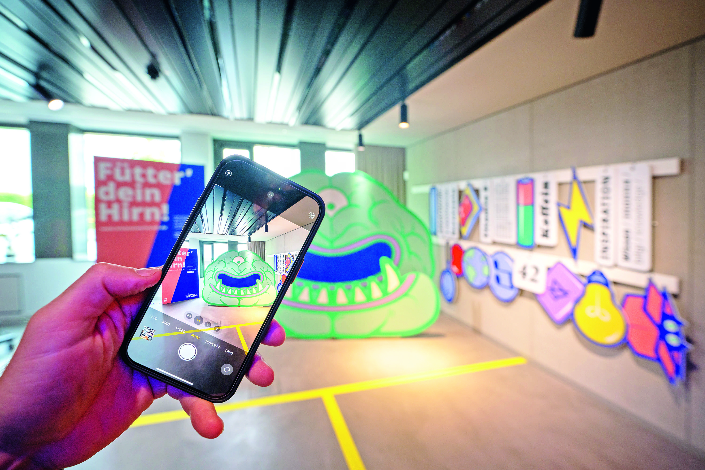 Ein Blick in die Ausstellung "Kosmos Wissenswerkstadt" in der Lobby der Volksbank Bielefeld-Gütersloh am Kesselbrink.