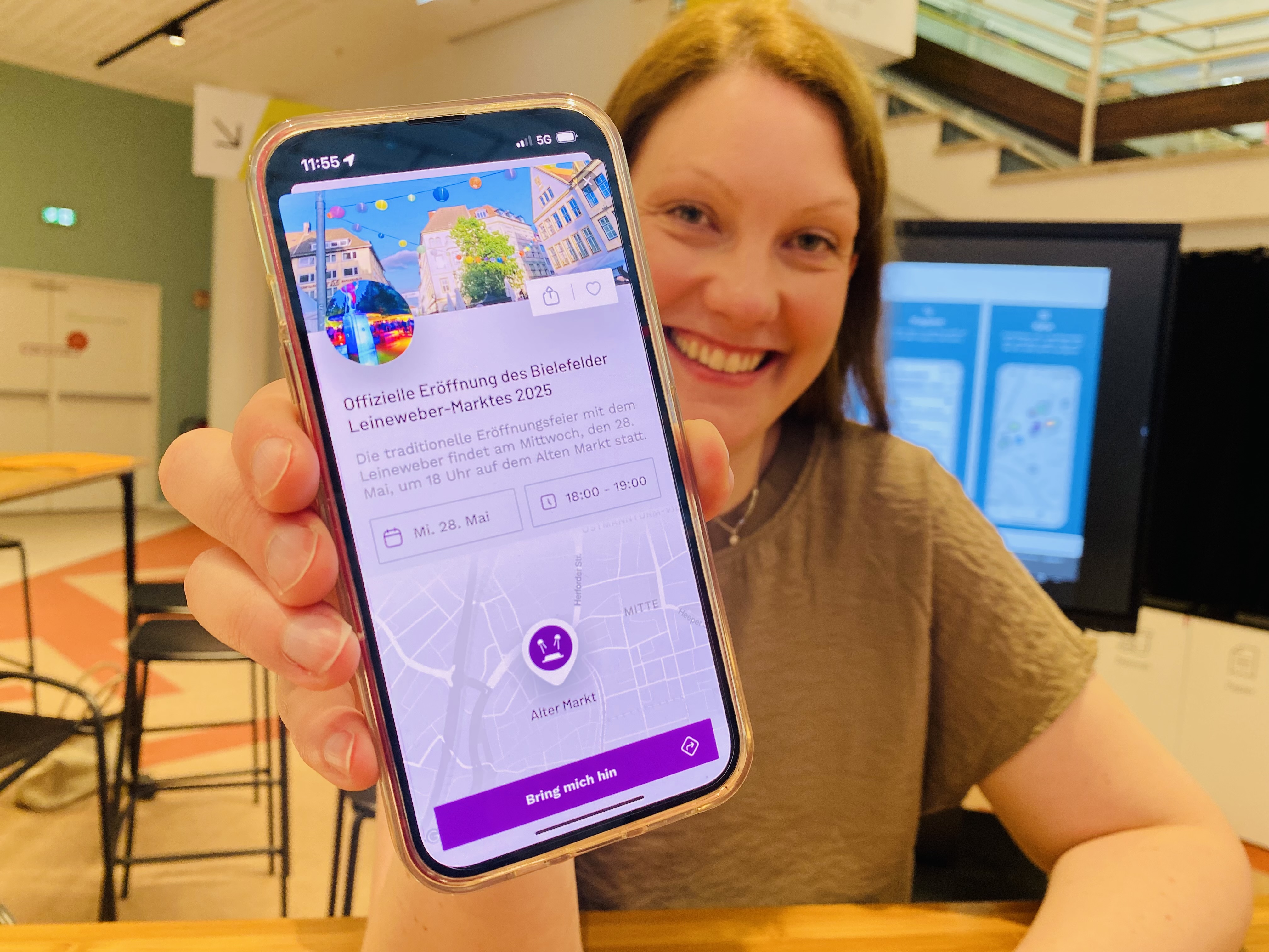 Christina Makowski von Bielefeld Marketing zeigt die neue Bielefeld.JETZT-App für Bielefelds Stadtfeste.
