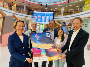 Jennifer Erdmann (l.) und Dr. Jörn Stöppel (r.) von der Sparkasse Bielefeld und Katharina Schilberg, Martin Knabenreich und Leonie Klau (v. l.) von Bielefeld Marketing präsentieren die Top-Acts und das gesamte Programm für das beliebte Stadtfest in der Bielefelder Innenstadt.