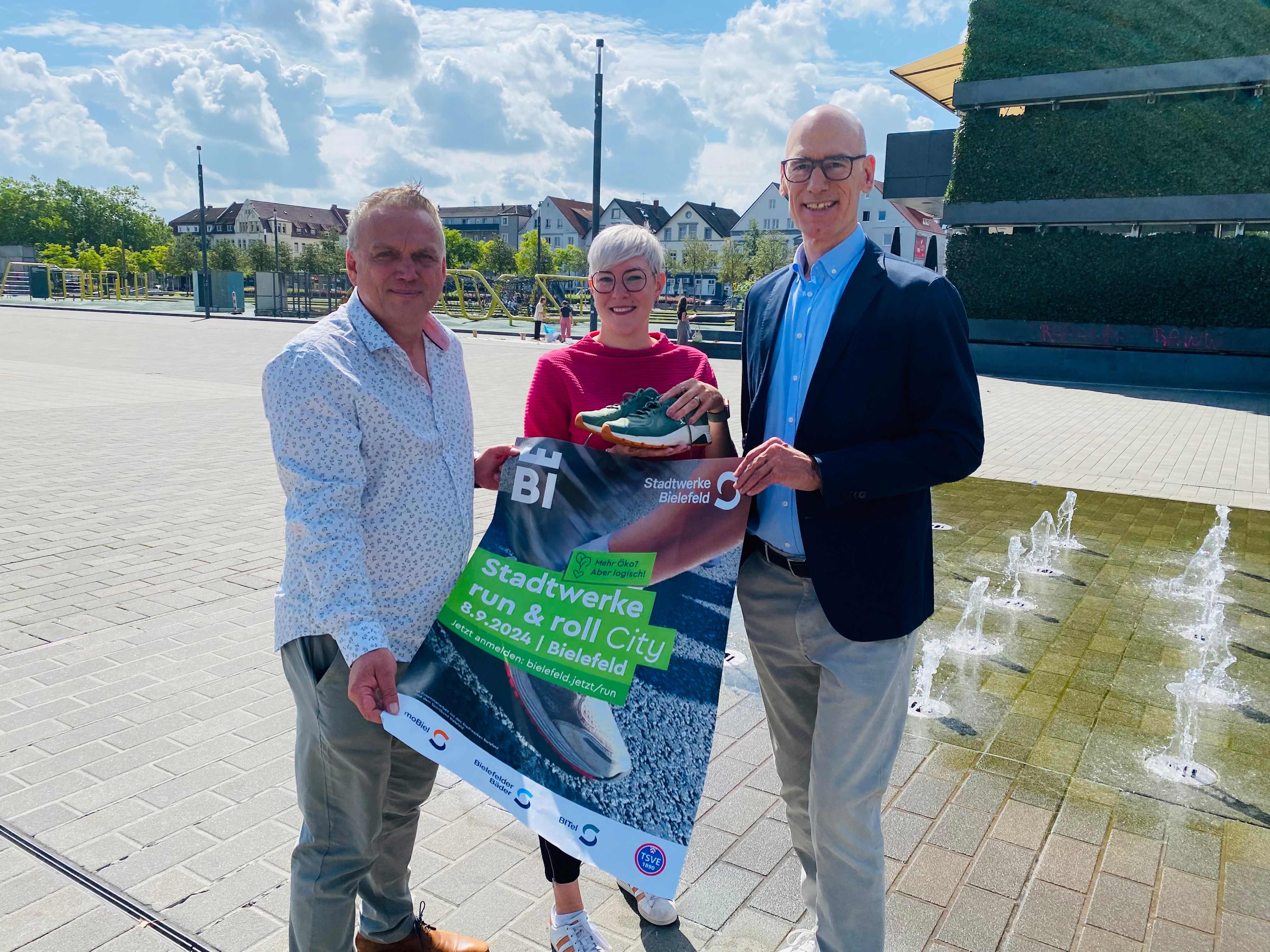 Katharina Schilberg von Bielefeld Marketing stellt gemeinsam mit Marcus Lufen (l.) und Rainer Müller von den Stadtwerken Bielefeld das Programm des 19. „Stadtwerke run & roll City“ am 8. September auf dem Kesselbrink vor.