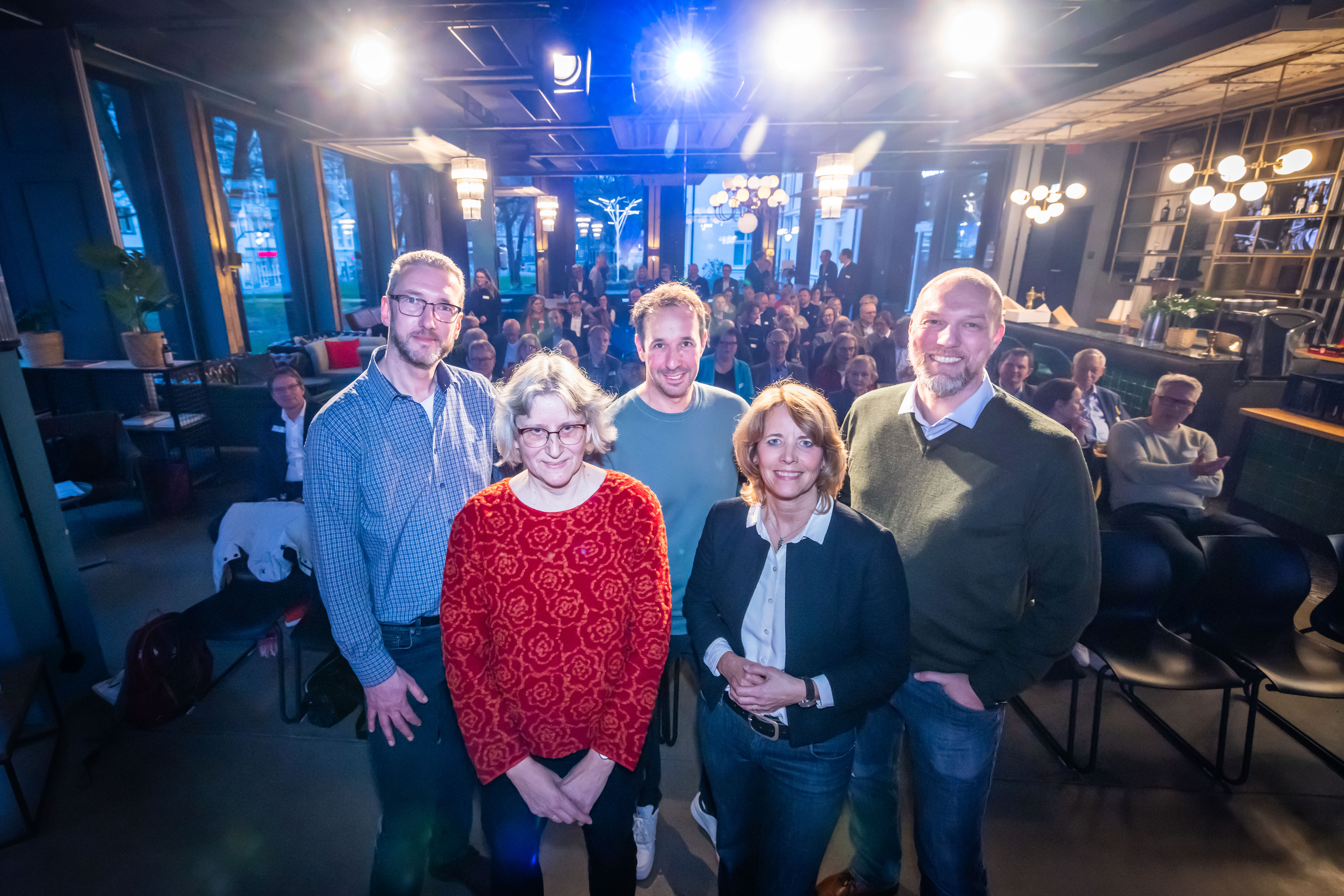 Einige Fachleute, Gastgeberin und Moderator der „Bielefelder Stadtgespräche“ waren diesmal (v. l.) Maik Greve, Heike Brand-Minich, Timo Fratz, Ursula Pasch, Professor Dr. Sebastian Zenker.
