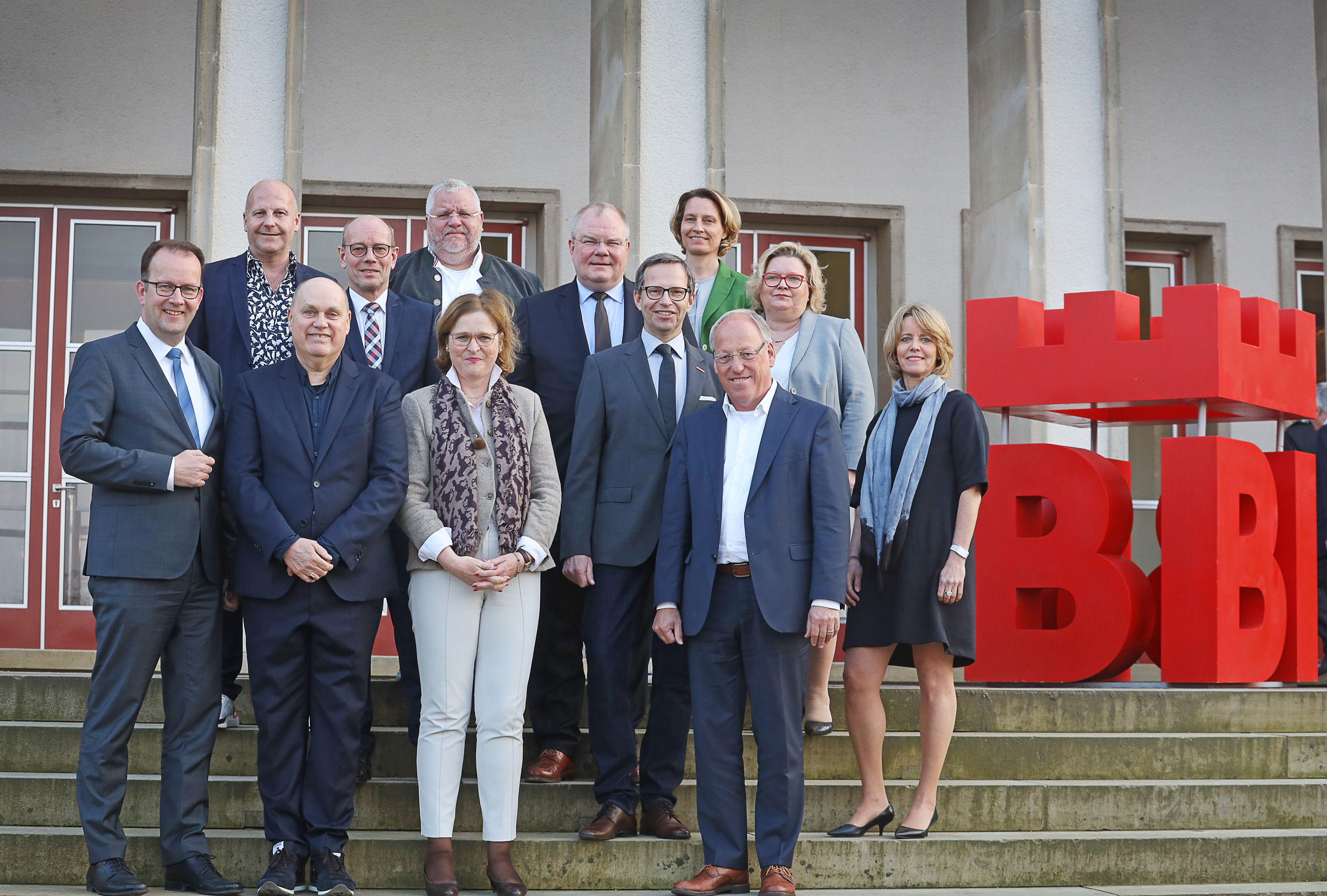 Jahresversammlung in der Rudolf-Oetker-Halle: (v.l.) Martin Knabenreich, Henner Zimmat, Theaterintendant Michael Heicks als Gastgeber, Thomas Kunz, Andreas Büscher, Cornelia Delius, Johannes Göke, Frank Wulfmeyer, Jennifer Erdmann, Oberbürgermeister Pit Clausen, Regine Tönsing und Ursula Pasch.