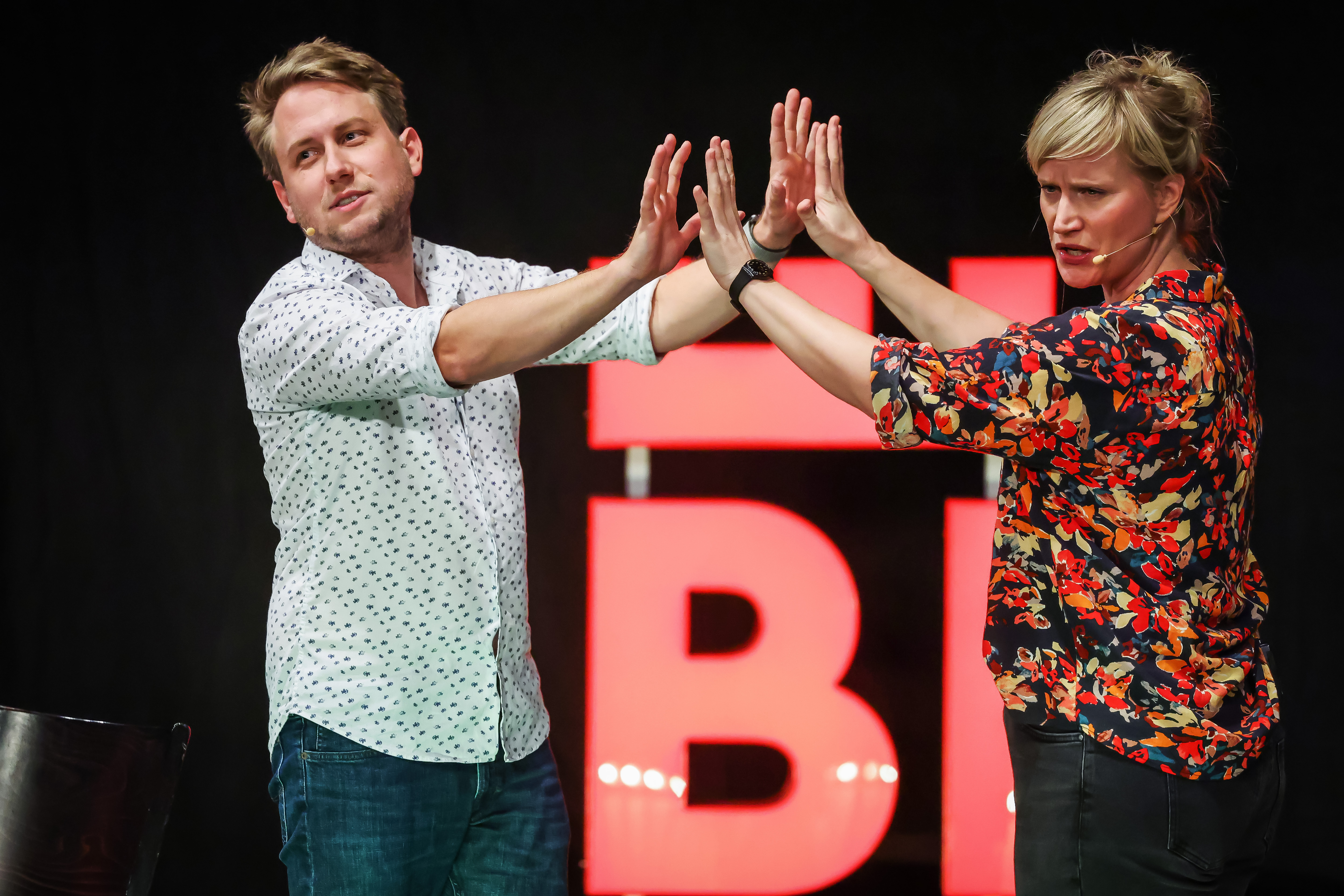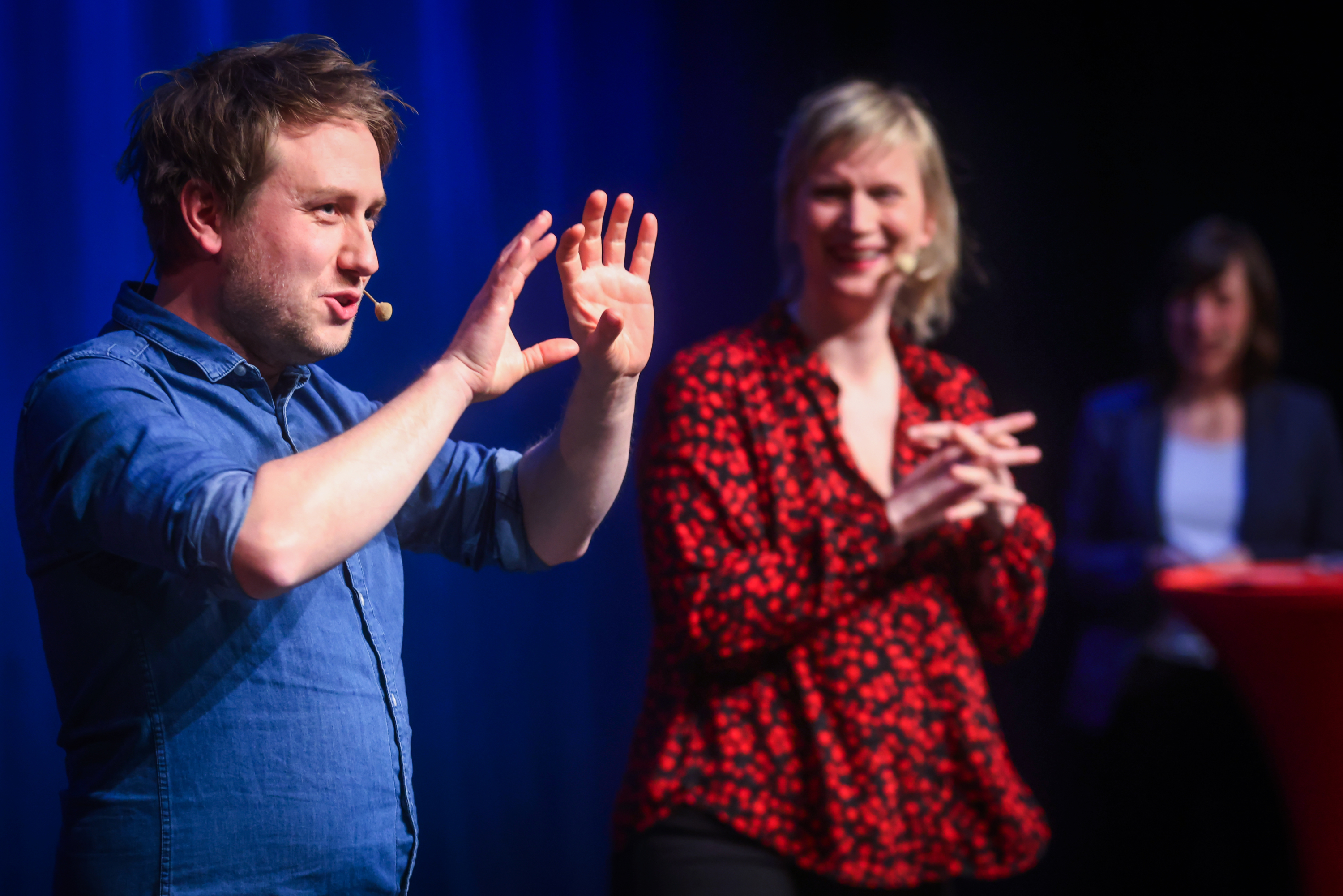 Die Wissenswerkstadt und die Moderatoren, die Impro-Traum-Duo Nele Kießling und Marvin Meinold (bekannt als „Die Stereotypen“), begrüßen auf der Bühne die Wissenschaftler Prof. Dr. Axel Schneider von der Hochschule Bielefeld (HSBI) und Prof. Dr. Volker Dürr von der Universität Bielefeld.