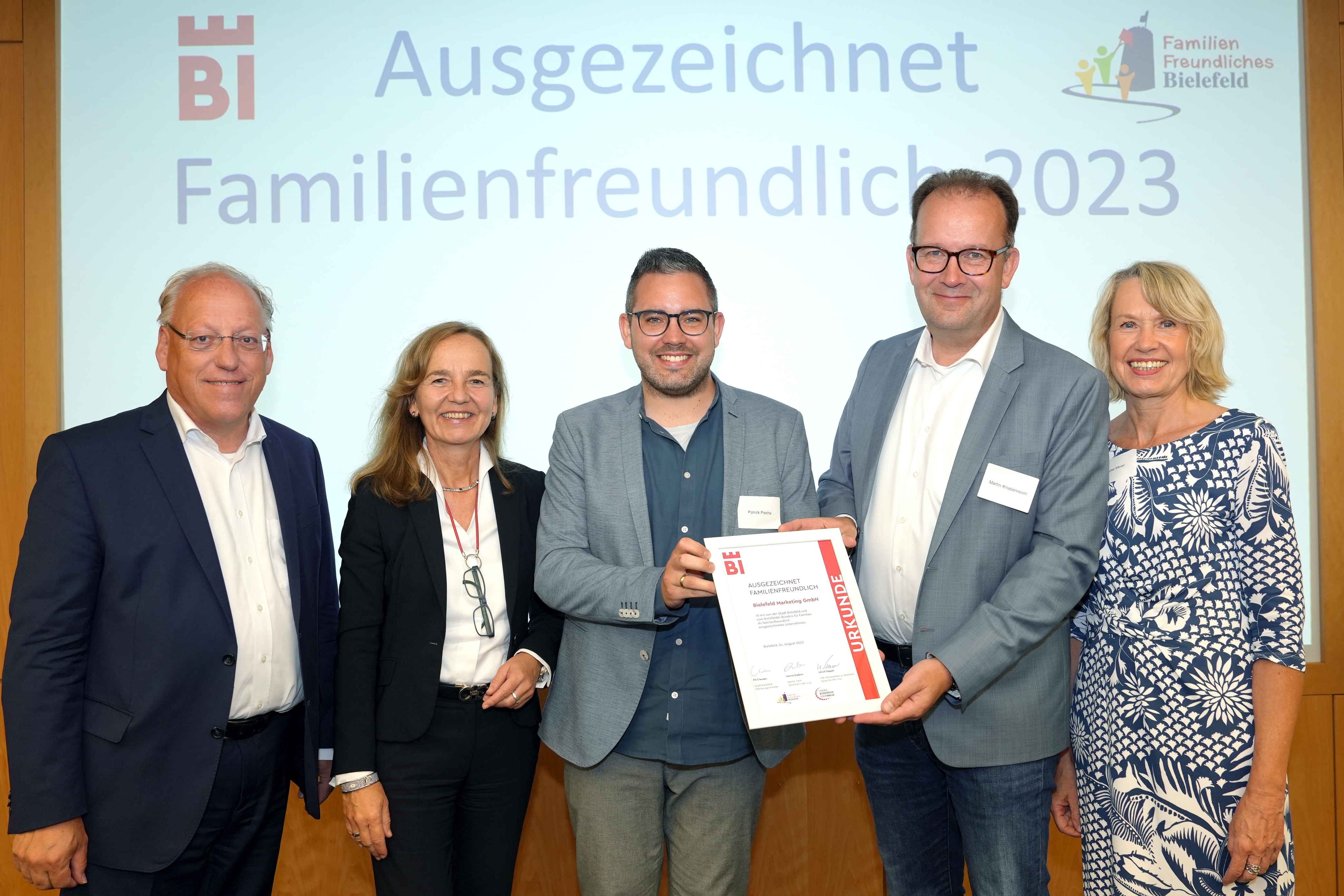 Bei einer Feierstunde in der IHK Ostwestfalen zu Bielefeld, am 24. August 2023, erhielt die Bielefeld Marketing GmbH die Urkunde „Ausgezeichnet Familienfreundlich 2023“ vom Oberbürgermeister der Stadt Bielefeld, Pit Clausen. Im Vorfeld konnte das Stadtmarketing-Unternehmen die Jury im Rahmen des Wettbewerbs „Ausgezeichnet Familienfreundlich Bielefeld“ durch sein vielfältiges, langjähriges Engagement für die Vereinbarkeit von Familie, Freizeit und Beruf überzeugen.