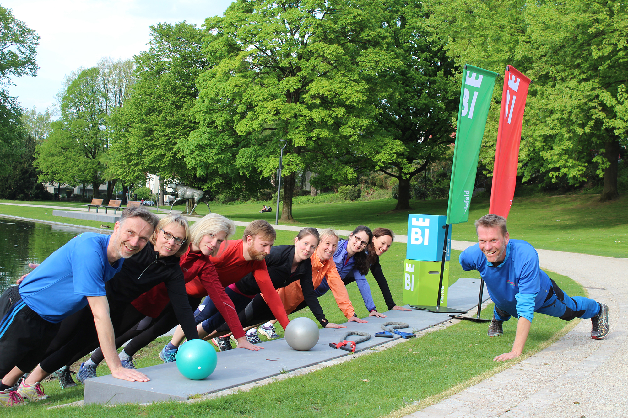 Eine Outdoor-Sport-Tournee an der frischen Luft – und das in den beliebtesten Grünzügen der Stadt: Das neue Konzept „Bielefeld kommt raus! Sport im Park“ bringt die Stadt richtig in Bewegung. 90 kostenfreie Termine an neun Standorten von Juni bis September 2018 mit intensivem Crossout-Tranining, Yoga, Pilates und mehr. Die Sport-Flashmob-Serie ist eines der drei Siegerprojekte von „Deine Fan-Aktion für Bielefeld“. Im Frühjahr 2017 hatte Bielefeld Marketing den Projektwettbewerb als Kampagne des Stadtmarkenprozesses ins Leben gerufen. Dabei ging es darum: Gute Ideen für Bielefeld zu finden und zu fördern.