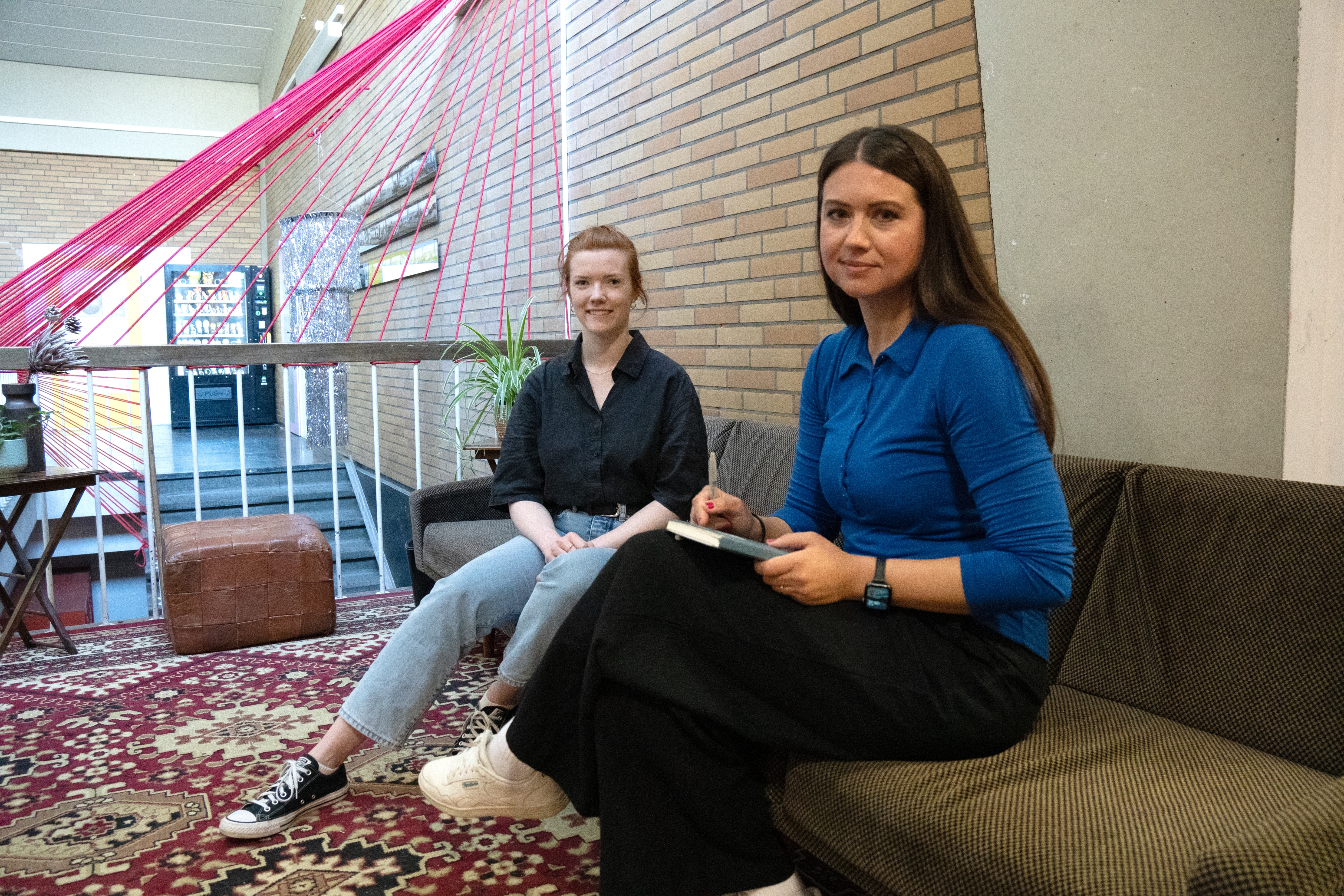 Laura Baß (l., Kulturamt) und Nadine Connor (Bielefeld Marketing) warten auf der Couch im Kulturhaus Ostblock auf die nächsten Akteurinnen und Akteure aus der Bielefelder Kulturszene, um sich auszutauschen, Themen zu bündeln und weiterzuentwickeln.