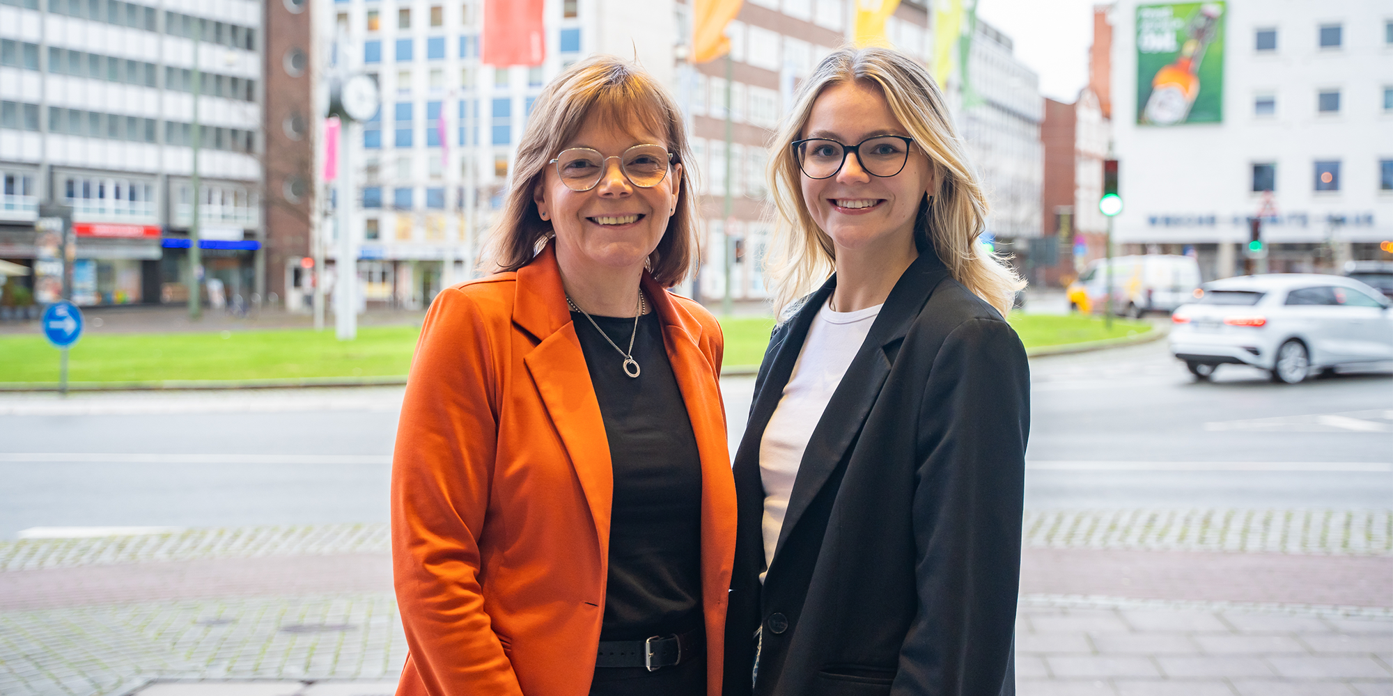 Gabriela Lamm (l.) und Mia Reckersdrees vom Kongressbüro der Bielefeld Marketing GmbH unterstützen Veranstalter u. a. mit kostenloser Standortberatung, der Vermittlung von Räumen und Technik sowie Hotelreservierungen.