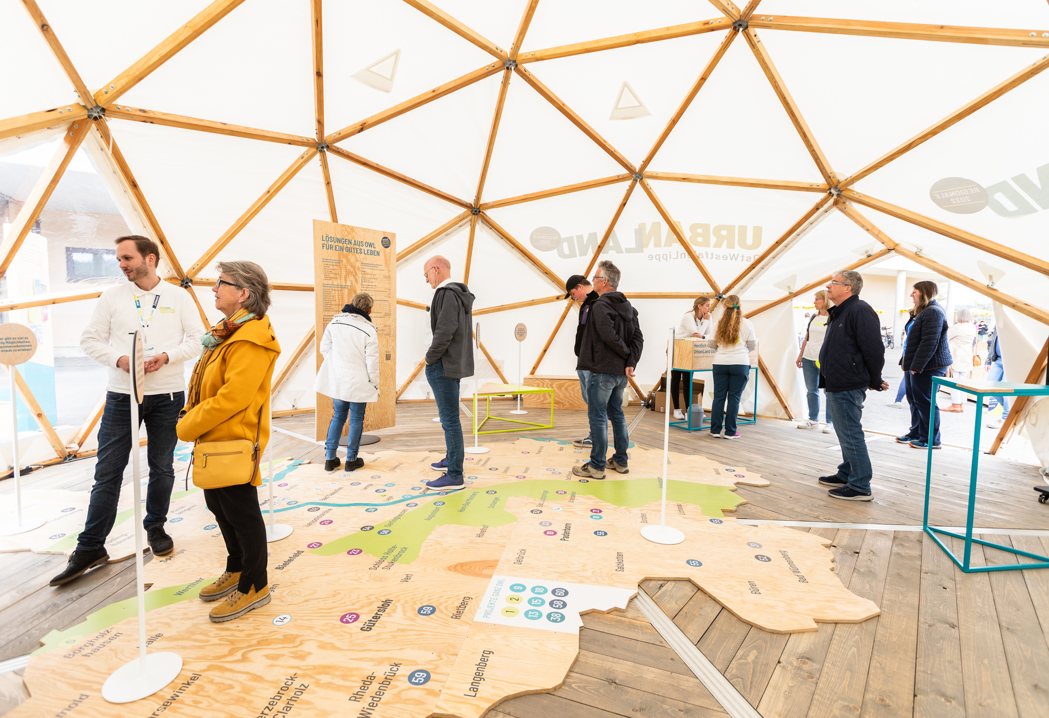 Am Niederwall/Ecke Rathausstraße ist die rund 300 qm große UrbanLand-Welt als Aktions- und Informationsfläche zu Gast. Ein großes Kuppelzelt und sieben Outdoor-Experimentier-Stationen laden dazu ein, sich mit den Themen der REGIONALE zu beschäftigen.