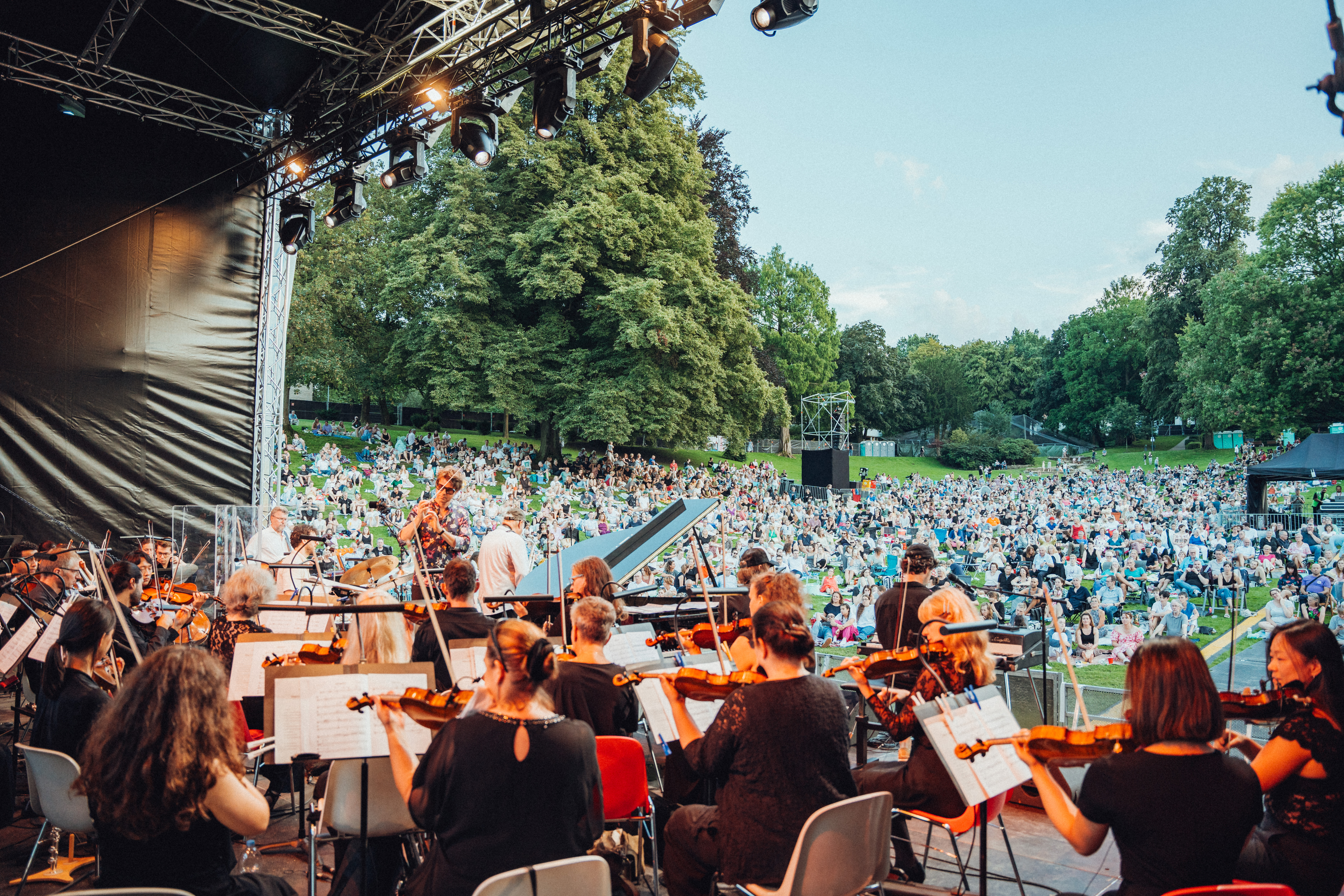 Die Bielefelder Philharmoniker spielen am 11. Juli 2025 wieder in ihrem „Garten“ neben der Rudolf-Oetker-Halle im Bielefelder Bürgerpark.