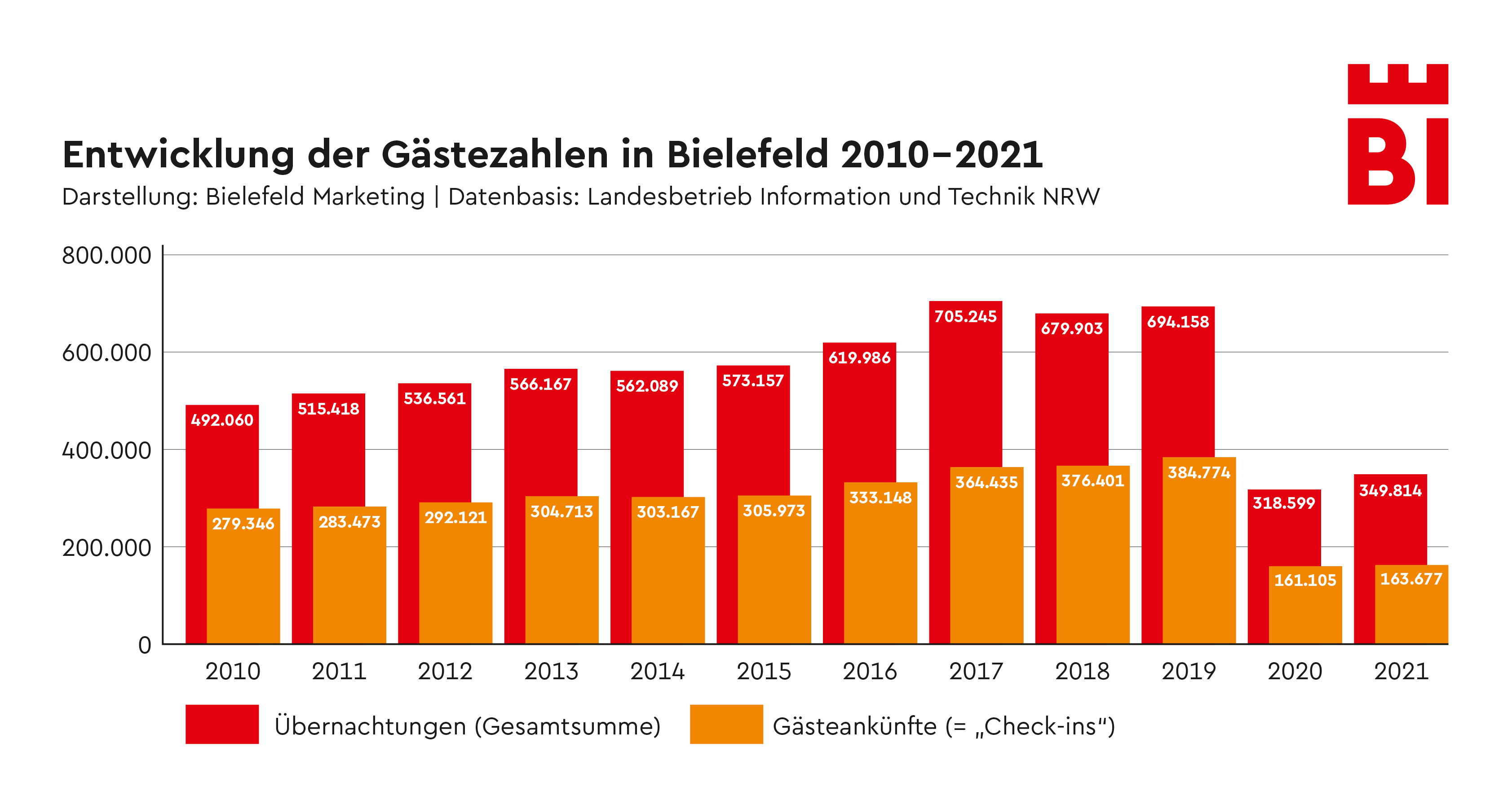 Demnach verzeichnen Hotels und Pensionen in Bielefeld im vergangenen Jahr 163.677 Gästeankünfte (plus 1,6 Prozent im Vergleich zu 2020, minus 57,5 Prozent verglichen mit 2019) sowie 349.814 Gesamtübernachtungen (plus 9,8 Prozent im Vergleich zu 2020, minus 49,69 Prozent verglichen mit 2019). In der Statistik werden alle Beherbergungsbetriebe ab mindestens zehn Betten erfasst – in Bielefeld 57 Betriebe mit insgesamt 4.357 Betten.