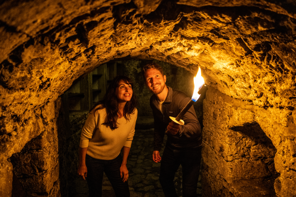 "Lunte riechen" oder "vom Pech verfolgt sein": Erstaunlicherweise prägen Redewendungen aus dem Burgenalltag längst vergangener Tage noch heute unseren Sprachgebrauch. Bei der 45-minütigen Kasematten-Tour erhalten die Besucher einen spannenden Einblick in mehr als 750 Jahre Burggeschichte und können das 300 Meter lange unterirdische Gangsystem der Sparrenburg in Augenschein nehmen. Dicke Steinmauern, dunkle Verliese und enge Lichtschächte veranschaulichen eindrucksvoll, unter welchen Bedingungen die Soldaten damals Burg und Stadt vor feindlichen Eroberungen verteidigt haben.